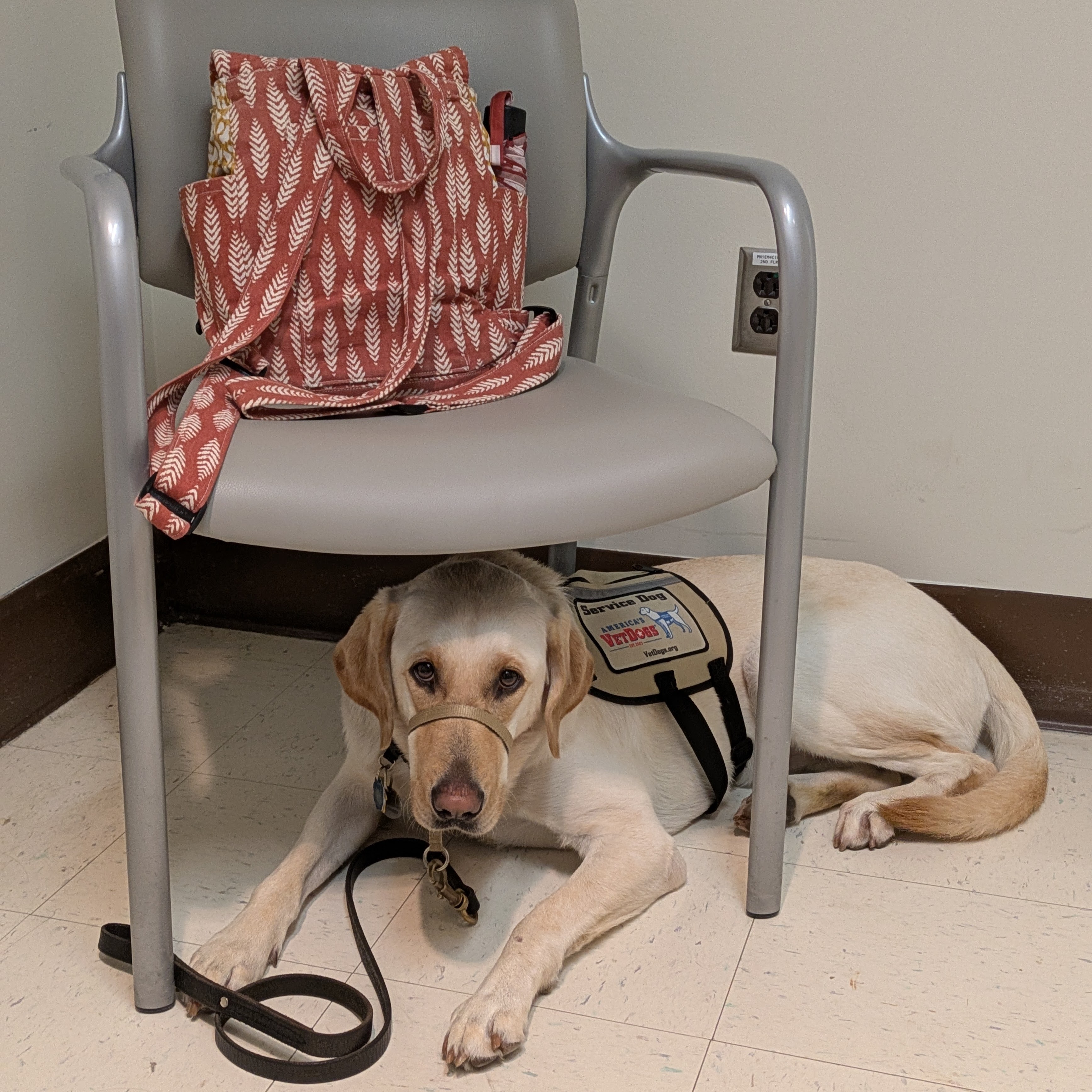 To be clear, for this visit, we had literally walked about ten steps into the exam room and sat down in a chair. Judy remained “under” the chair for the duration of the 20-minute visit. That was it. No doors to open and no mobility support needed. Judy was working, just quietly—like she so often does.